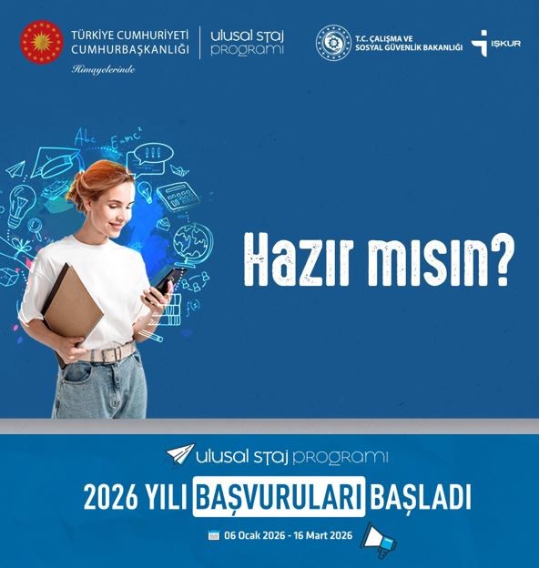 Cumhurbaşkanlığı Ulusal Staj Programı kapsamında üniversite (fakülte ve yüksekokul) öğrenci başvuruları başlamıştır. 06.01.2026 tarihinde öğrenci başvuruları başlamış olup staj başvurusunda bulunacak üniversite (fakülte ve yüksekokul) öğrencilerinin kayıtlarını 16.03.2026 tarihine kadar https://ulusalstajprogrami.iskur.gov.tr/ üzerinden yapmaları gerekmektedir.