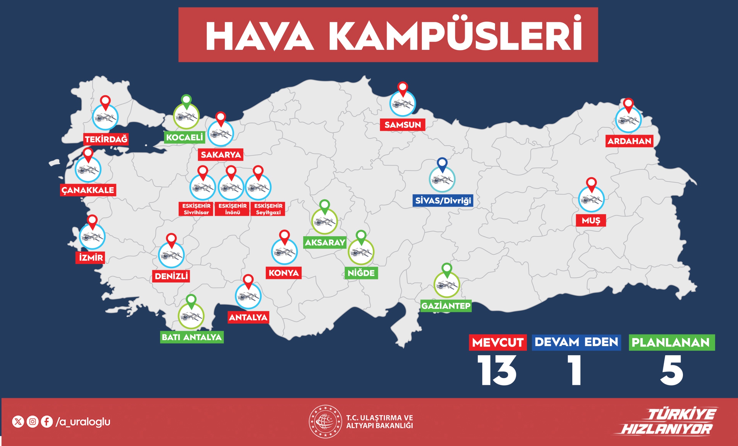 helikopter inişi yapılabilen hava kampüslerin ise Muş, Denizli, İzmir Aliağa,