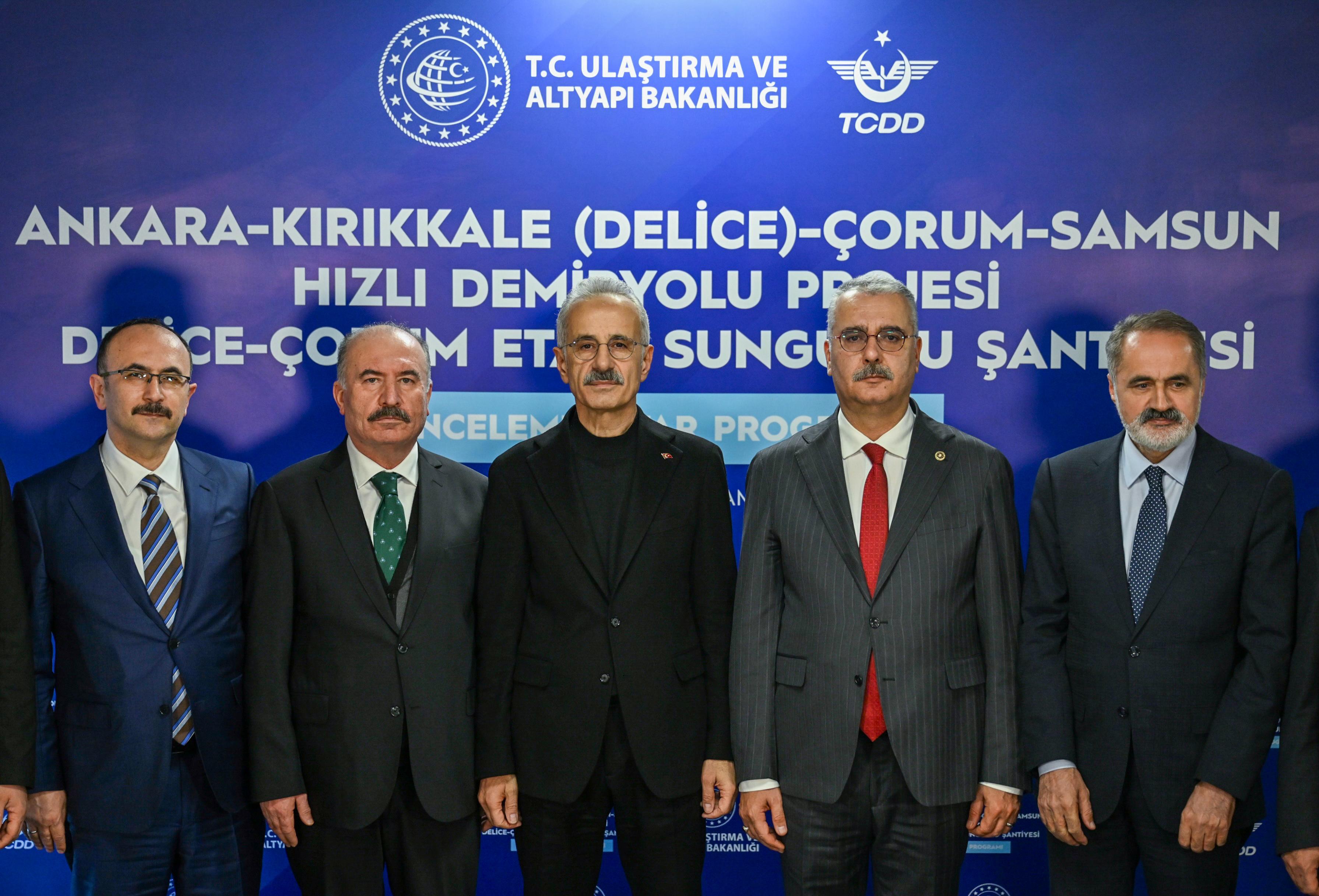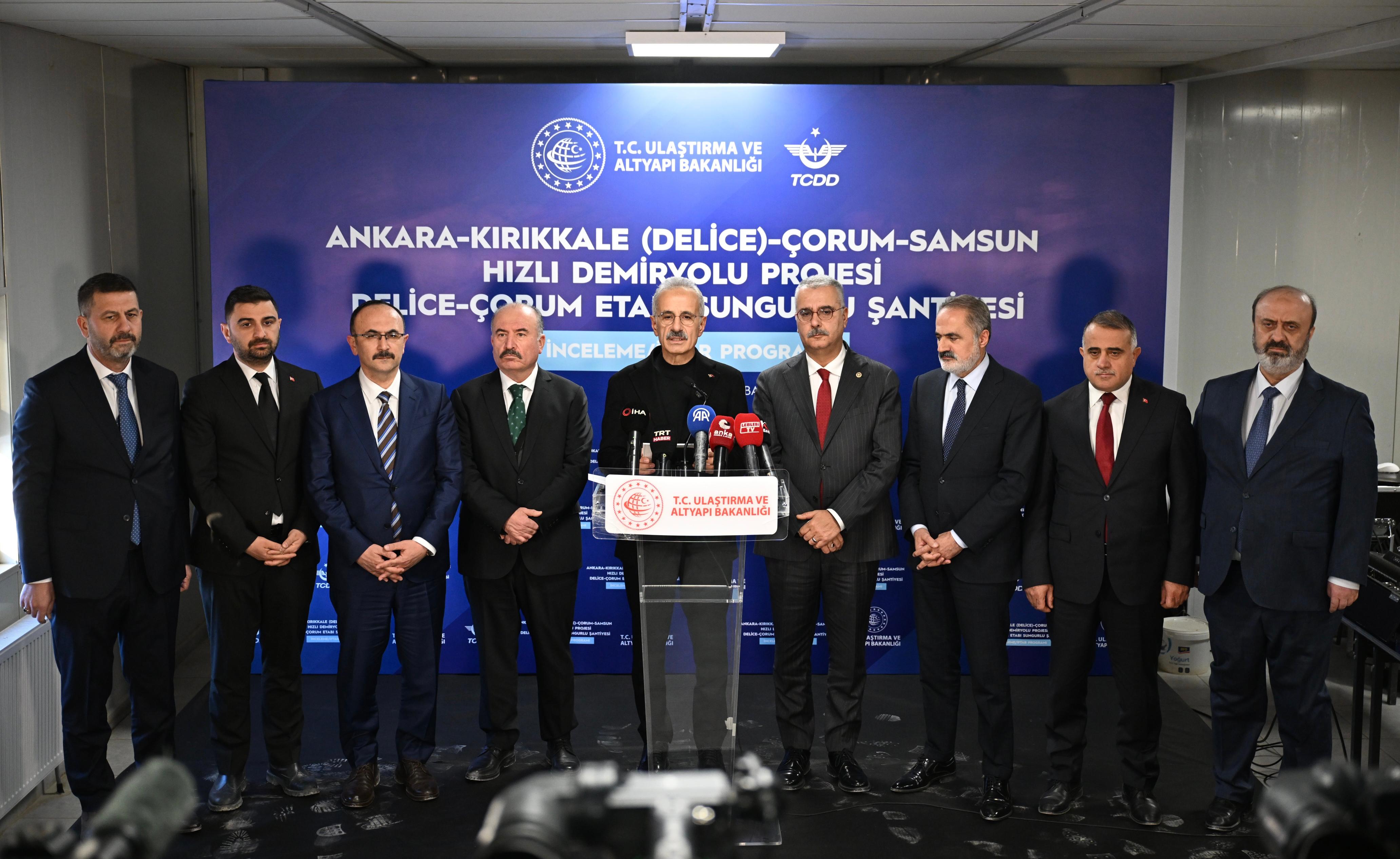 “Delice’den başlayarak Çorum, Merzifon’u da geçip Samsun’a ulaşacak 293 kilometrelik yeni hızlı tren hattının 120 kilometrelik Delice - Çorum kesimini; 3.000 personel ve 850 makineyle gece gündüz çalışarak hayata geçiriyoruz. Bugün itibarıyla, bu etabımızdaki genel fiziki ilerlememiz yüzde 25’lere yaklaştı. Kazı çalışmalarında 27,61 milyon metreküp kazı yaparak yüzde 87 gerçekleşme sağladık. 8 tünelde toplam 9 bin 507 metrede yaklaşık yüzde 19 ilerleme sağladık. 31 köprüden 13’ünde yapım çalışmalarımızı sürdürüyoruz. Aç-kapa yapılarında, alt ve üst geçitler ile menfezlerde de çalışmalarımıza hız kesmeden devam ediyoruz. 200 km hıza uygun bir şekilde planlanan bu hattımız tamamlandığında Ankara-Kırıkkale-Çorum arasında kesintisiz hızlı tren bağlantısı sağlanacak ve Çorum-Ankara arası 1 saat 20 dakika olacak. Ayrıca hattımızın devamındaki Çorum ile Samsun arasını da bu yıl yatırım programına aldık. İnşallah onun yapım ihalesini de yıl içerisinde gerçekleştirmeyi planlıyoruz”