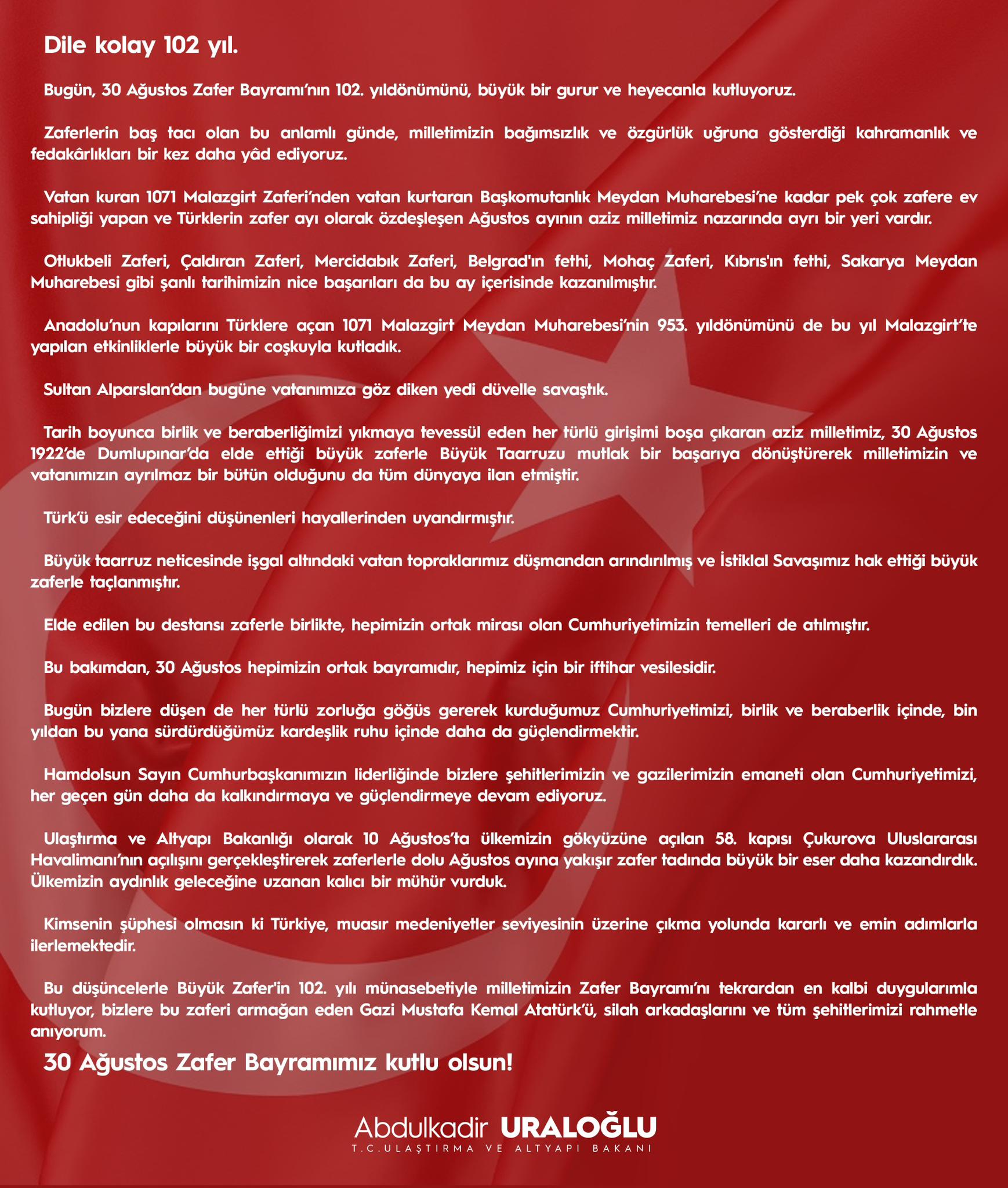ve Altyapı Bakanı Abdulkadir Uraloğlu, 30 Ağustos Zafer Bayramı’nın 102.