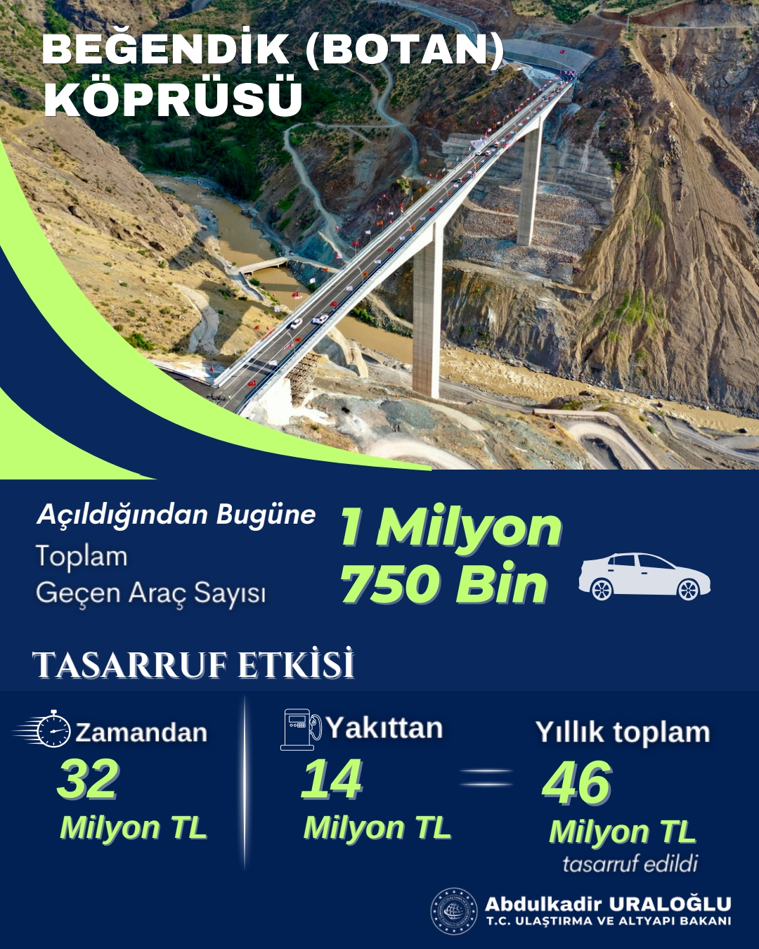 750 bin araç geçerek, yakıt ve zamandan toplam 46 milyon lira tasarruf elde