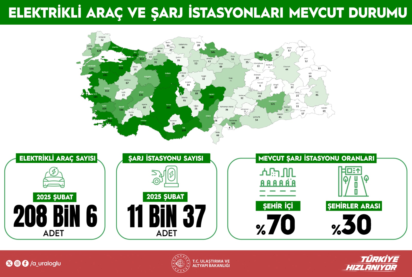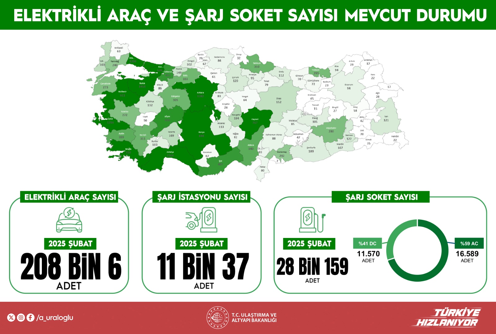 Uraloğlu, 2025 yılı şubat ayı sonu itibariyle elektrikli araç şarj soket sayısının