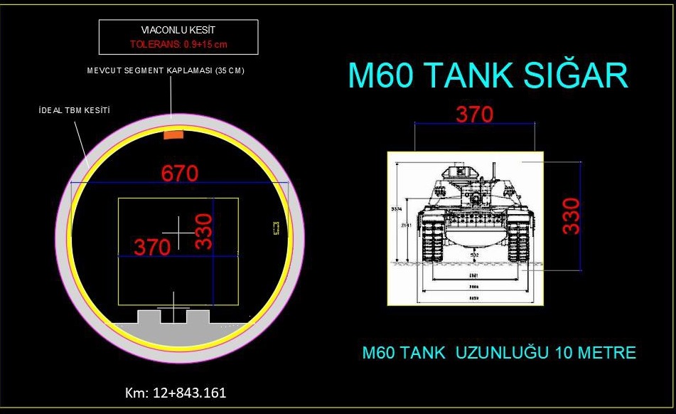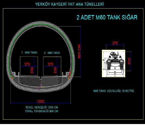 metre, yüksekliği 8 metre olan çift hatlı demiryolu tünellerimiz; iki M60
