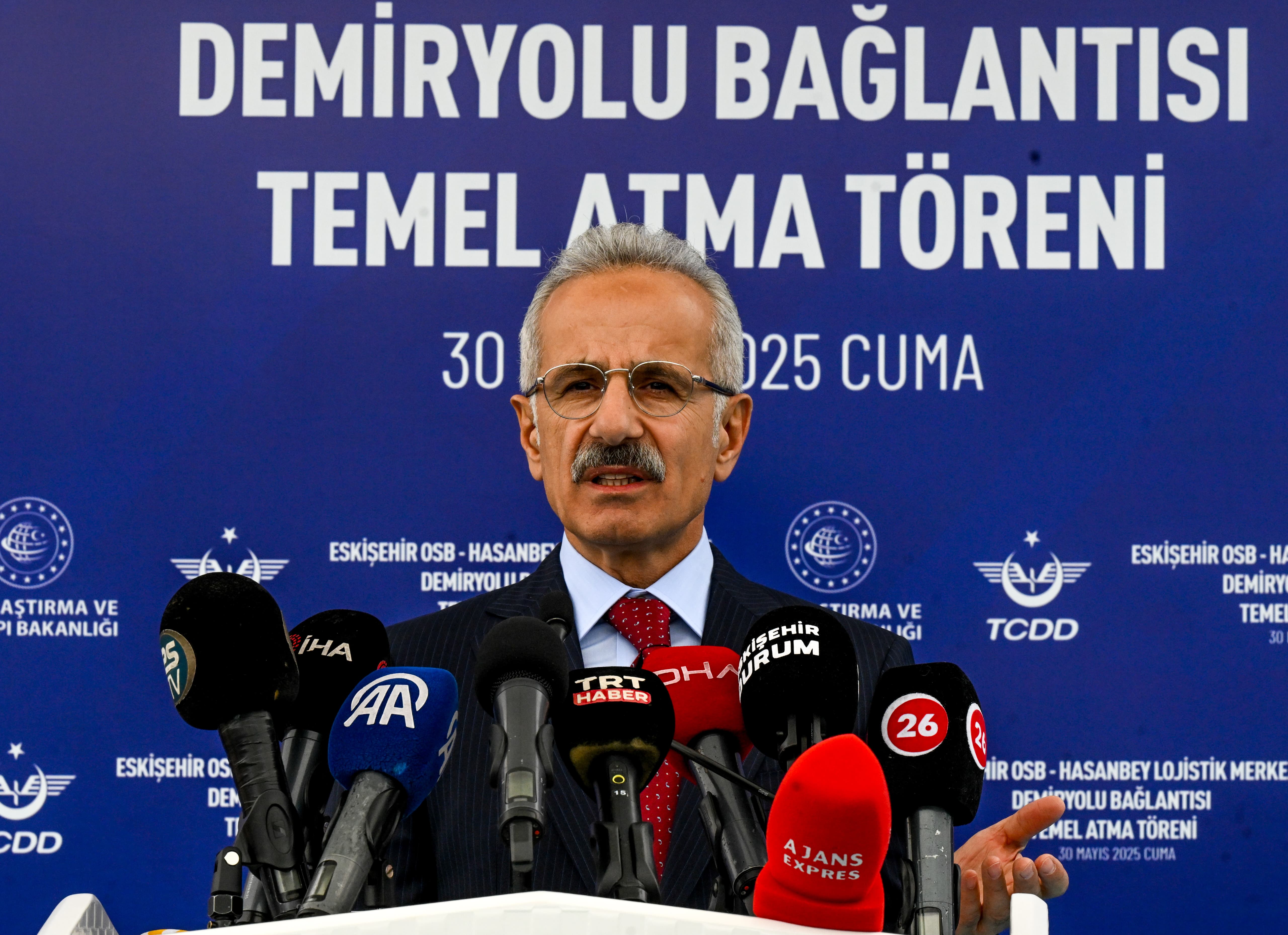 Ulaştırma ve Altyapı Bakanı Abdulkadir Uraloğlu, Eskişehir OSB - Hasanbey Lojistik Merkezi Demiryolu Bağlantısı Temel Atma Töreni’nde konuştu. Bakan Uraloğlu, bugün TÜRASAŞ tesislerinde üretilen yerli ve milli elektrikli lokomotif ve tren setlerinden yük ve yangın söndürme vagonlarına uzanan araçları TCDD Taşımacılık’a teslim ettiklerini hatırlatarak “Şimdi de Eskişehir OSB-Hasanbey Lojistik Merkezi Demiryolu Bağlantısı temel atma törenini gerçekleştirerek Eskişehir’in geleceğine atılan sağlam bir adımı daha hayata geçirmenin gurur ve mutluluğunu yaşıyoruz.” dedi.