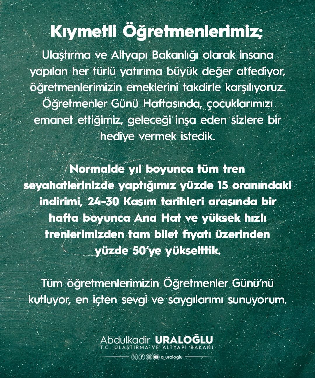 Abdulkadir Uraloğlu, 24 Kasım Öğretmenler Günü nedeniyle 24-30 Kasım tarihleri