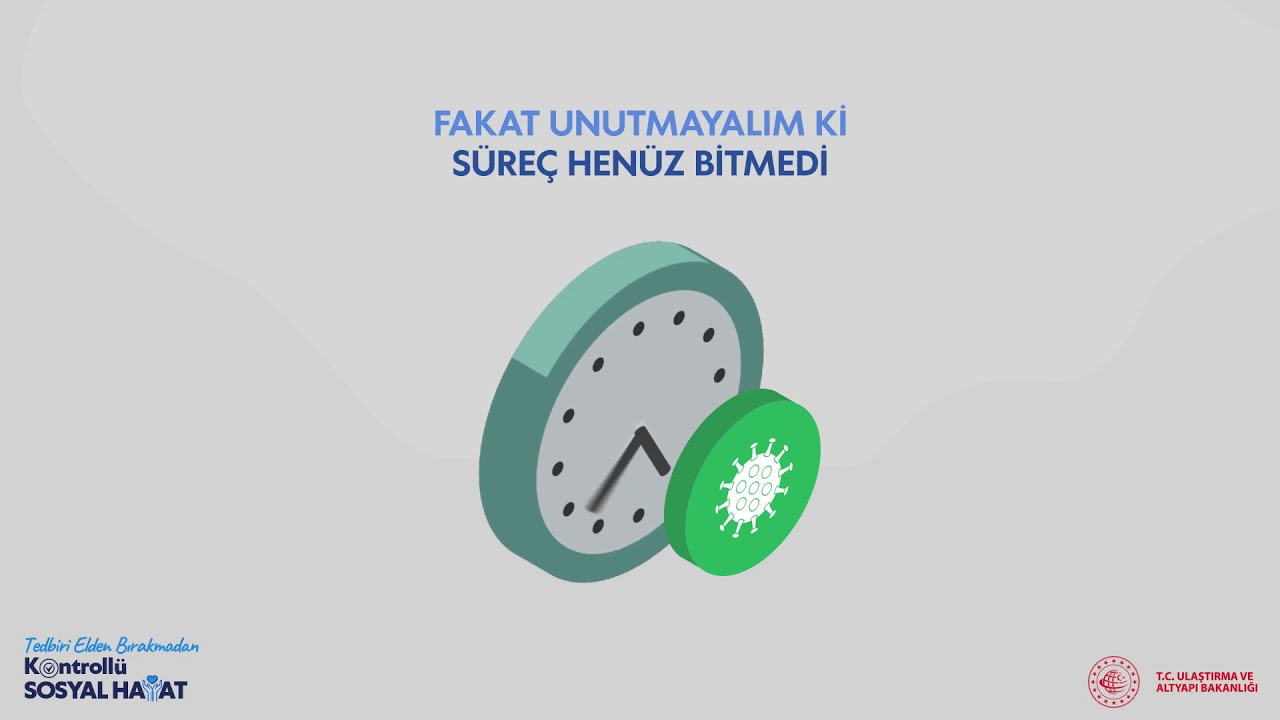 Ulaştırma ve Altyapı Bakanlığı, Koronavirüs tedbirleri ve 'Kontrollü Sosyal Hayat'a ilişkin kamu spotu yayınladı. Önlemler sayesinde salgına karşı her geçen gün iyi neticeler alındığı ancak sürecin devam ettiği belirtilen kamu spotunda; tüm çalışma alanlarında önlemlerin devam ettiği vurgulandı. Bu kapsamda PTT şubelerinin ve trenlerin dezenfekte edildiği, yüksek hızlı trenlerde sosyal mesafeye uygun olarak yolcu taşındığı, şantiyelerde önlemlerin en üst düzeyde tutulduğu belirtildi.